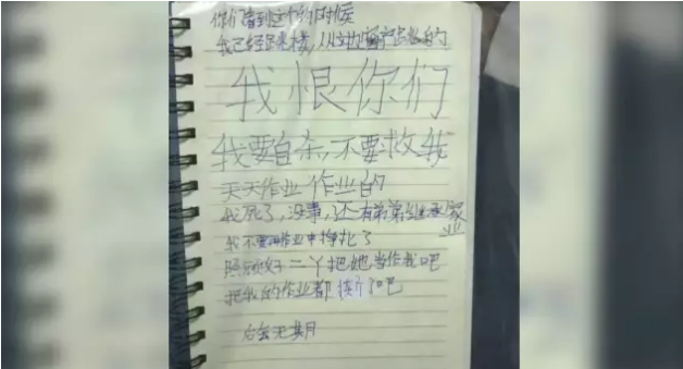 一份疑似女孩儿留下的遗书让人十分揪心,上面写着:“我恨你们 把我的作业都撕了吧”。