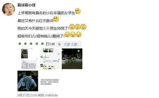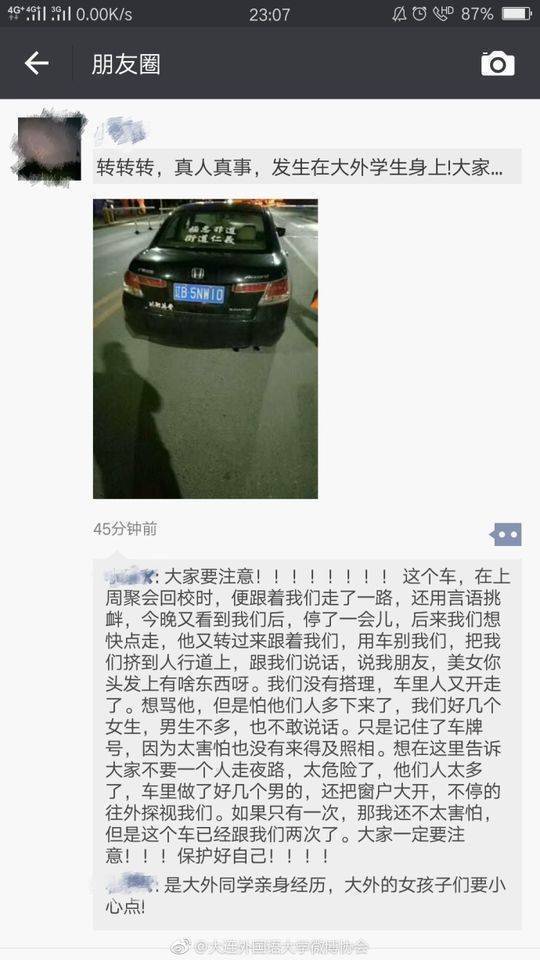 据网友爆料,27日晚间,大连外国语大学女生晚上回学校时,在校内遇到一辆私家车开车尾随,车内男子语言轻佻,出言不逊,对女生造成骚扰。