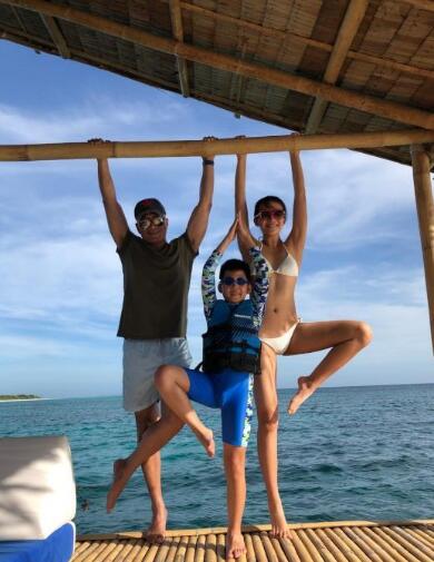 在卢芳晒出的一张照片中,九儿穿着比基尼和爸爸胡军、弟弟康康一起出镜。