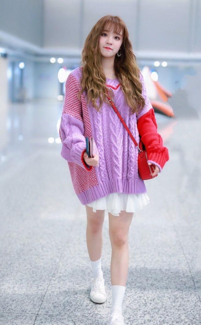 宋雨琦外面穿的毛衣很好看,这毛衣主要是紫色的,但是在右侧的衣袖,领口袖口还有左侧的位置都有红色的元素,这样会显得衣服更加有设计感一点,穿上这毛衣后,她看上去特别淑女。