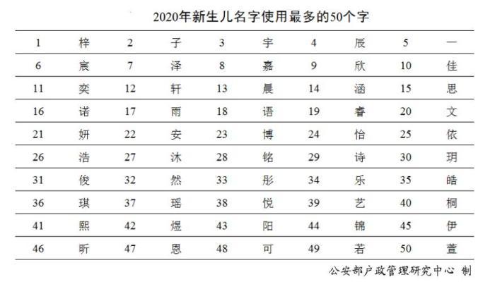 报告称,2020年出生并已经进行户籍登记的新生儿名字中,使用频率最高的50个字依次为“梓”“子”“宇”“辰”“一”等。与2019年相比,“玥”“伊”“昕”“可”等字受到新生儿父母的青睐。