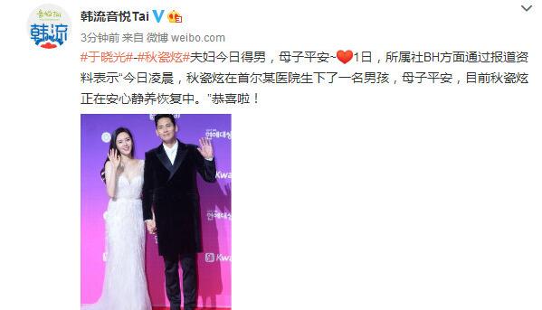 6月1日消息,据报道,演员于晓光的韩籍演员妻子秋瓷炫所属社BH方面通过报道资料表示“今日凌晨,秋瓷炫在首尔某医院生下了一名男孩,母子平安,目前秋瓷炫正在安心静养恢复中。”