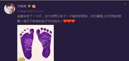 随后,秋瓷炫的老公于晓光晒出儿子小脚丫印出的照片,还感谢妻子:“老婆辛苦了!今天,这个世界又多了一个爱你的男孩,你们都是上天对我的恩赐!祝天下所有的孩子节日快乐!”网友们纷纷送上祝福。