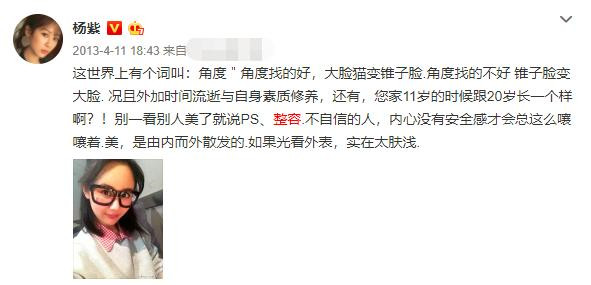 其实对于明星来说去保养也好,小调整也好,都是属于正常的,没必要大惊小怪。但由于之前就有网友曾质疑过杨紫整容,对此杨紫也发文声明否认过,说是角度找的好。如今,杨紫被拍到现身整容医院,疑似打脸之前的否认内容。