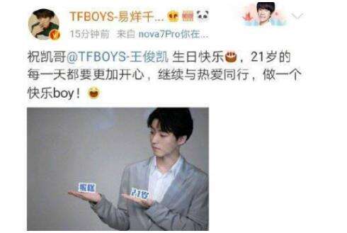 王源、易烊千玺零点准时晒出表情包为小凯庆生,“兄弟生日快乐,21岁继续做自己喜欢的事情”,“祝凯哥生日快乐,21岁的每一天都要更加开心,继续与热爱同行,做一个快乐boy!”