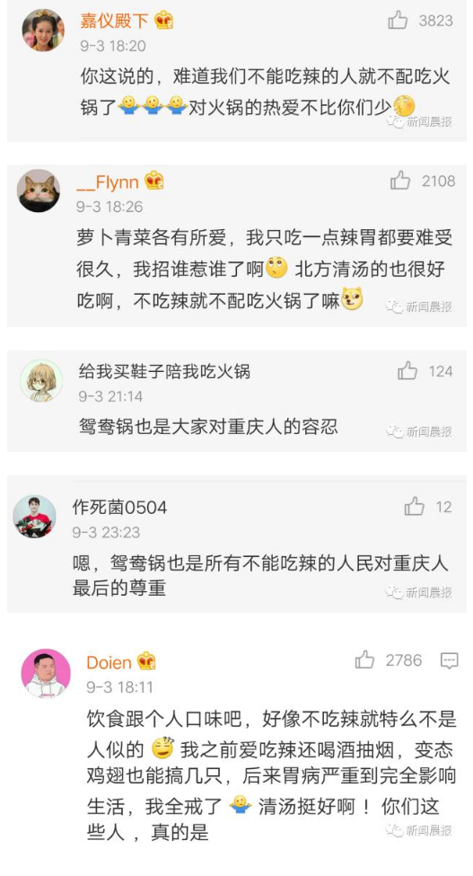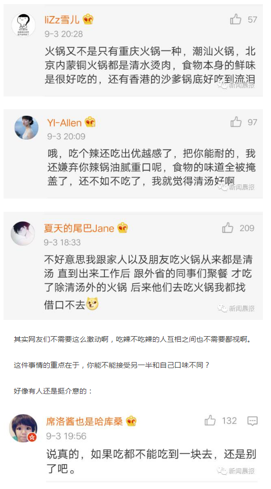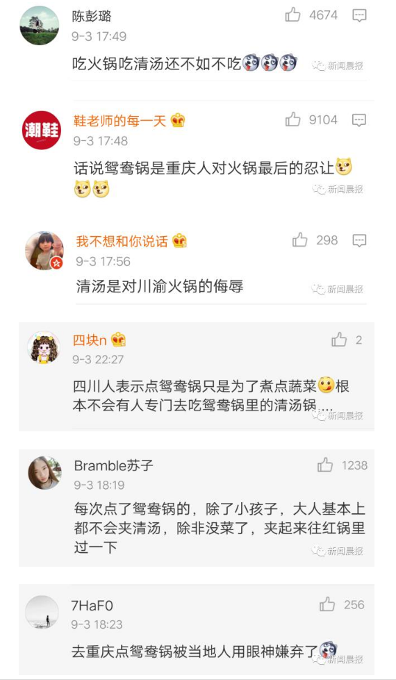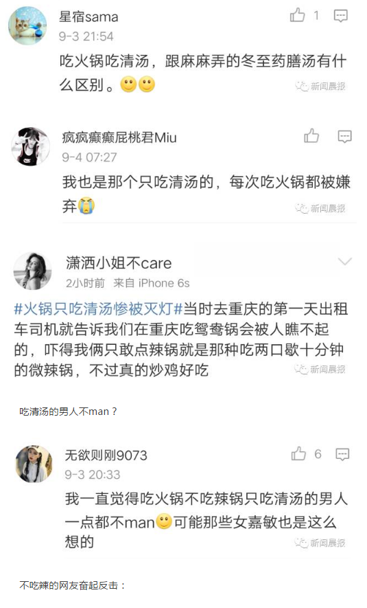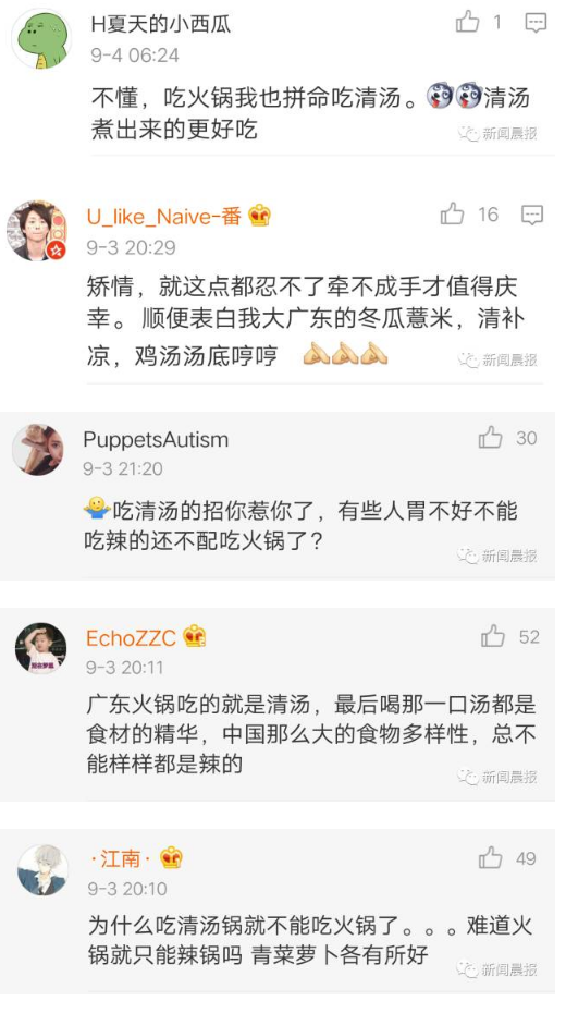 然后事件发酵到了网上,围绕着“吃火锅吃清汤”这个话题,网友展开了一番大战……