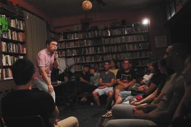 9月16日,郝雨在三里屯附近的休闲吧表演脱口秀。