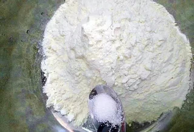 步骤1、首先将面粉放到一个大点的搅拌盆中,在面粉中加入一小勺食盐。食盐不用加太多,按照图片中的样子加一小平勺的一半就可以。