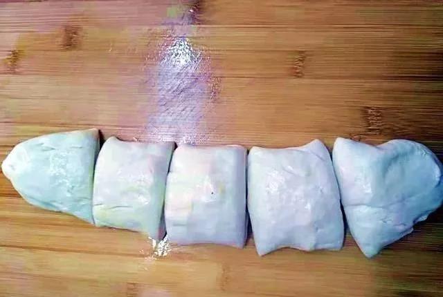 步骤4、将揉好的面团揉成长条,分成五个均等一些的小剂子,准备开始做手抓饼。