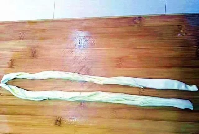 步骤5、将其中一个小剂子用擀面杖擀成长条状。需要注意的是一定要擀薄一些,可以尽可能的长尽可能的宽。擀薄一些对后面做里嫩的手抓饼里层非常有帮助。