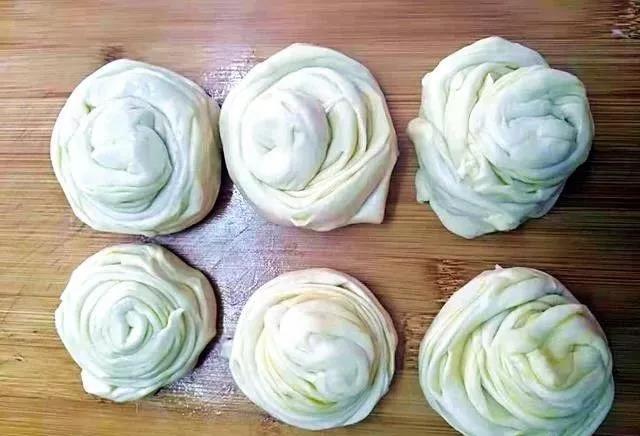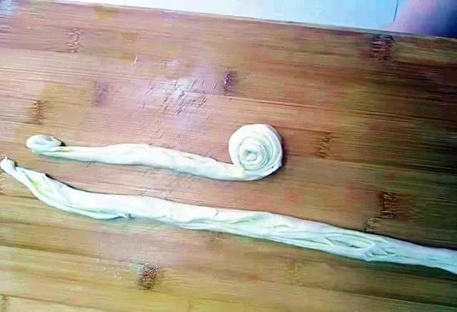 步骤9、卷成几个面卷的样子如下。这时候看到面卷已经被油分成很多层了,这样烙饼就能多层。
