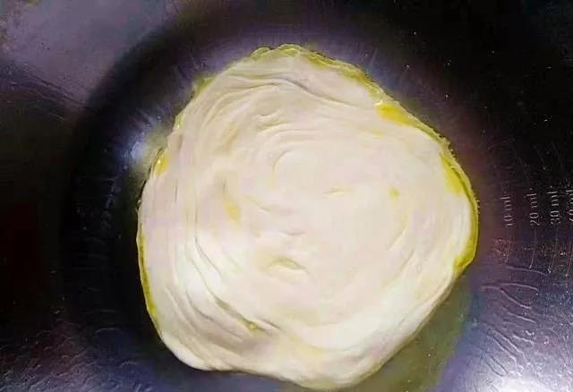 步骤11、锅中加少量油均匀涂抹到锅底部,防止烙饼时候糊锅。等油热之后把手抓饼放进去,煎到两面金黄就可以出锅。因为面皮非常薄,烙饼的时间估计在一分钟左右。