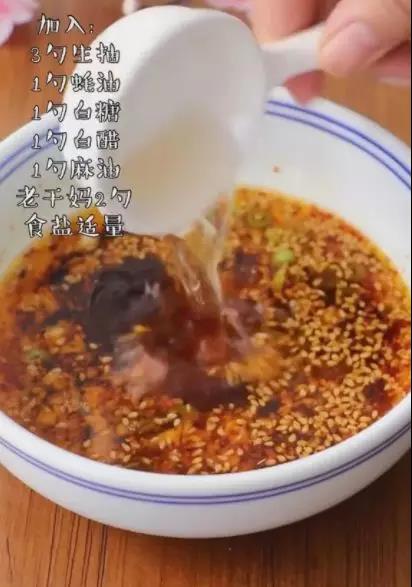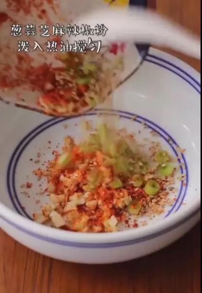 碗中放入葱蒜芝麻辣椒粉,泼入热油搅匀