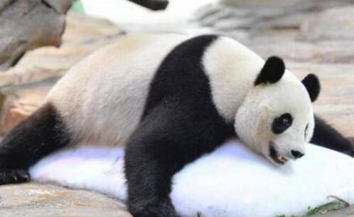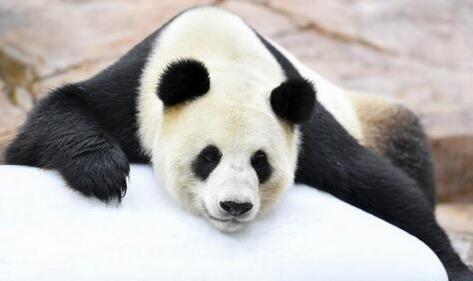 5月11日,生活在广州长隆野生动物世界的大熊猫“婷婷”趴在冰块上卖萌消暑,样子悠闲安逸十分憨态可掬,引游客争相拍照。