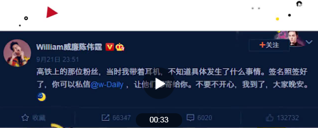 陈伟霆在个人社交平台上发文回应在高铁上要签名的粉丝引发网友热议,事后回应解释称自己当时戴着耳机,不知道具体发生了什么事情,并暖心表示:“签名照签好了,可以私信工作人员,让他们邮寄给你。不要不开心,我到了,大家晚安。”太暖太温柔了。