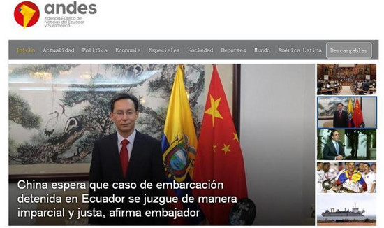 2017年8月31日,驻厄瓜多尔大使王玉林就中国渔船被扣案接受厄瓜多尔国家通讯社安第斯通讯社的采访。