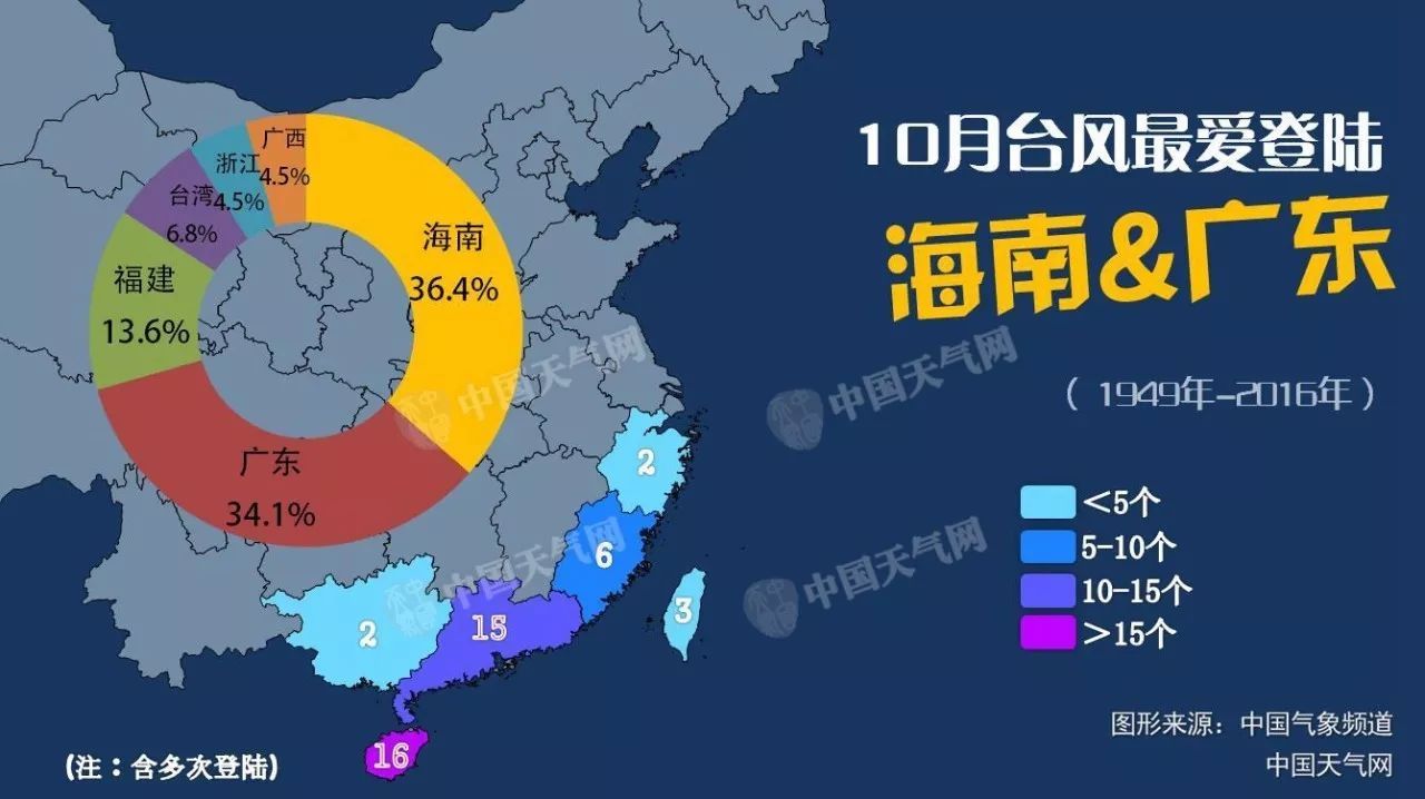 数据统计显示,10月风登陆我国的台风更偏爱海南和广东,这是因为进入秋季以后,影响热带气旋路径的副热带高压开始东退南移,位置逐渐偏南而造成的。1949年-2016年共有16个台风于10月份在海南登陆,广东也有15个,遥遥领先于广西、福建等地。