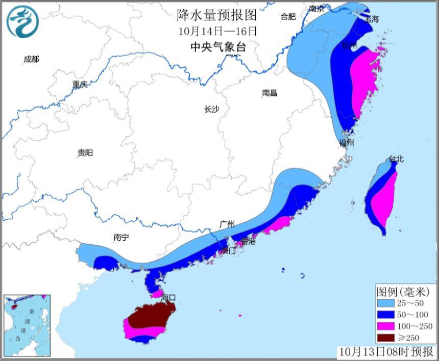 中央气象台预计,14日至16日,受“卡努”及冷空气共同影响,台湾、江苏南部、安徽南部、上海、浙江、福建东部、广东东部和南部、广西南部及海南有大到暴雨,其中台湾、浙江东部、广东东部沿海及海南的局部地区有大暴雨,过程累积雨量40-80毫米,台湾、浙江东部、海南局地80-150毫米,其中海南点雨量最大可达250-320毫米。