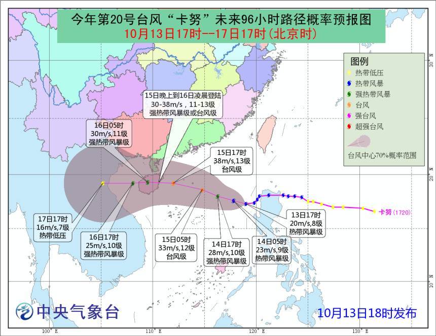 菲律宾以东热带低压12日下午加强为今年第20台风“卡努”,中央气象台预计,台风将逐渐向我国海南岛东部和广东西部一带沿海靠近,强度逐渐加强,最强可达强热带风暴级或台风级(11-13级,30-38米/秒),将于15日晚上到16日凌晨在海南三亚到广东湛江一带沿海登陆(11-13级,30-38米/秒),尚不排除从海南岛南部近海海面经过、趋向越南北部的可能。由于预报时效较长,公众仍需关注临近预报。