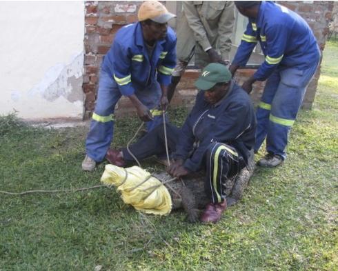工作人员在一番来来回回折腾后,终于将鳄鱼制伏,用绳索将嘴巴捆住拉至野外河中放生。