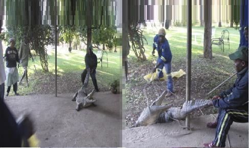工作人员到场后,本想用绳子拴住鳄鱼但没成功,几个人就合力拉住尾巴,将鳄鱼往外拽!