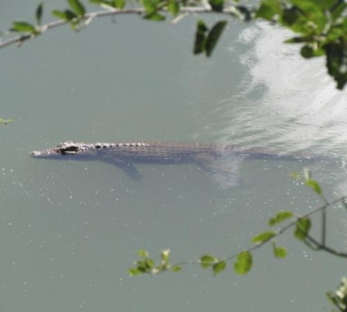 女子看见鳄鱼后慌忙大叫,这头鳄鱼应声伸出了头,一对眼神恶狠狠的盯着女子,女子吓得慌忙报警求助。