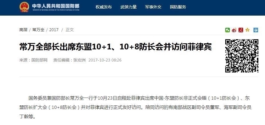 国务委员兼国防部长常万全一行于10月23日启程赴菲律宾出席中国-东盟防长非正式会晤(10+1防长会)、东盟防长扩大会(10+8防长会)并对菲律宾进行正式友好访问。陪同访问的有南部战区副司令员董军、海军副司令员丁毅等。(来源:央视新闻)