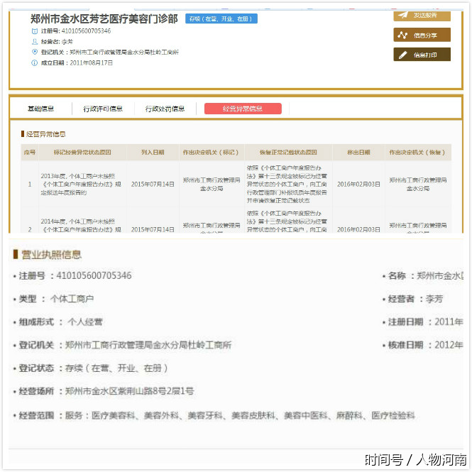 5月2日,记者查询了国家工商局网站得知,郑州艺芳整形医院实际上叫郑州市金水区芳艺医疗美容门诊部,在工商系统中郑州市金水区芳艺医疗美容门诊部还出现过两次经营异常信息。随后记者致电郑州艺芳整形医院,一位工作人员接到电话说我们反应的情况她会记录下来尽管落实情况,把这件事情反映给他们的领导,再给记者具体的回复。5月9日下午,记者见到郑州芳艺整形自称负责人的李女士,她告诉记者,他们并没什么过失之处,只是每个人的审美标准不一样,她觉得给陈女士做的挺成功的,面部和鼻子还有眼睛都挺好看的。