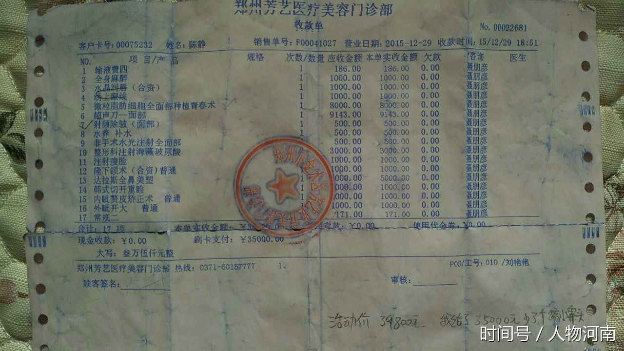 郑州市金水区芳艺医疗美容门诊部给陈女士出具的单据