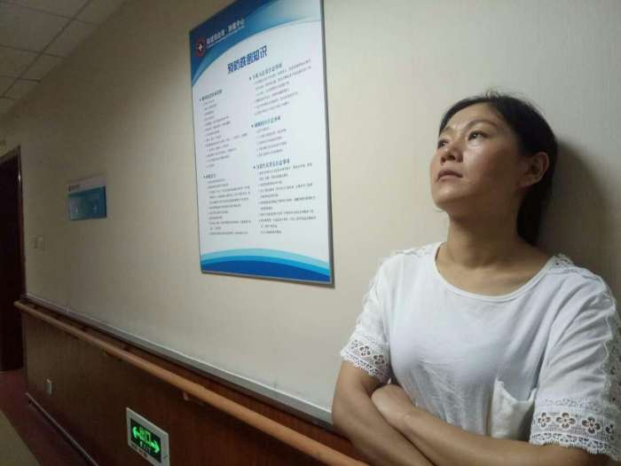6月23日,赵弘逸进行免疫治疗的第一天,发烧不断。医生告诉赵海栋、徐金凤夫妇,这个发烧是正常的,是用好的细胞去攻克坏的细胞,孩子可能会烧到浑身抽搐甚至昏迷,整个过程就如同去鬼门关走一遭,但这些都是必经之路。图为孩子在受罪,夫妻俩不能代替,在医院楼道里暗自垂泪。