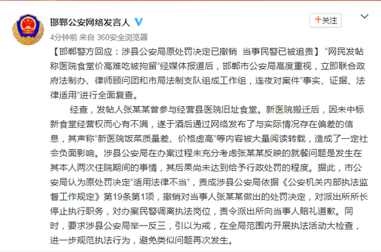 警方回应“网民发帖吐槽医院食堂价高被拘”:将重审