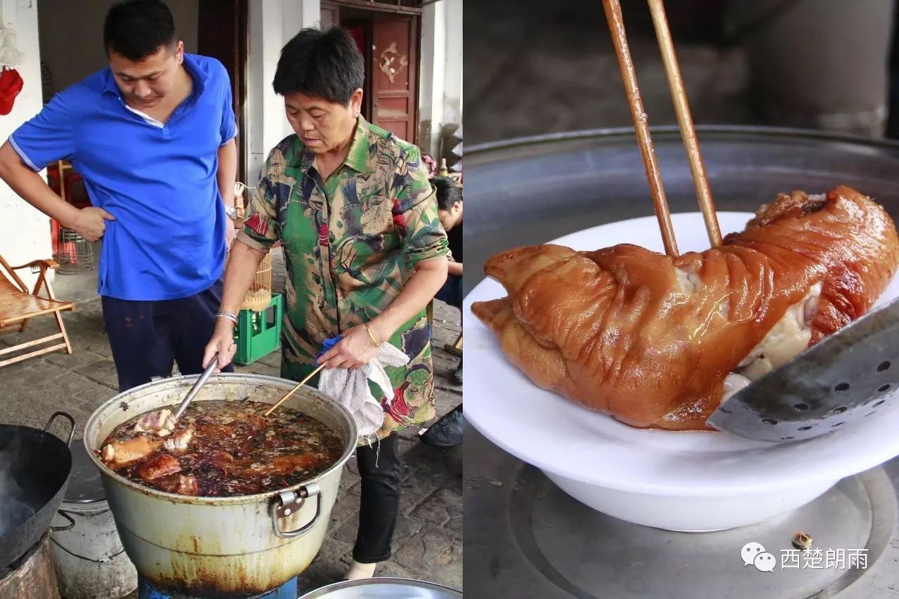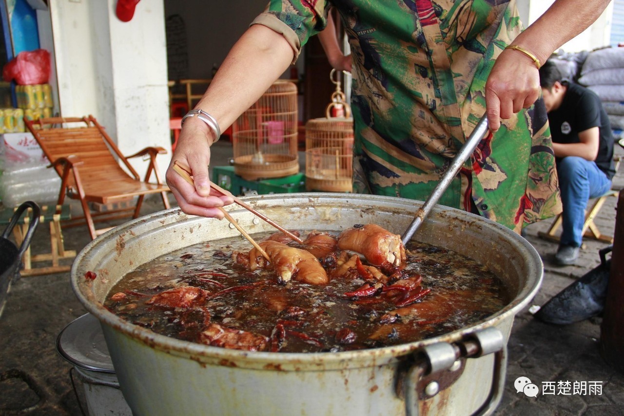 “老赵在古井镇卖卤猪蹄30多年了,最多一天能卖150只猪蹄!1只平均1斤半,卤好只卖20块1个,10年没涨过价!”赵大妈自豪地介绍。吃猪蹄的食客遍及邻近的河南安徽两省几十里,镇上几十家酒厂的外地客商也知名闻香,过来饕餮一顿。每个猪蹄子不论大小统统20块,生意好时,光卖猪蹄就月赚3万!图为安徽亳州市古井镇上赵家饭馆卤猪蹄的大锅和刚刚捞出的色泽诱人的大猪蹄。