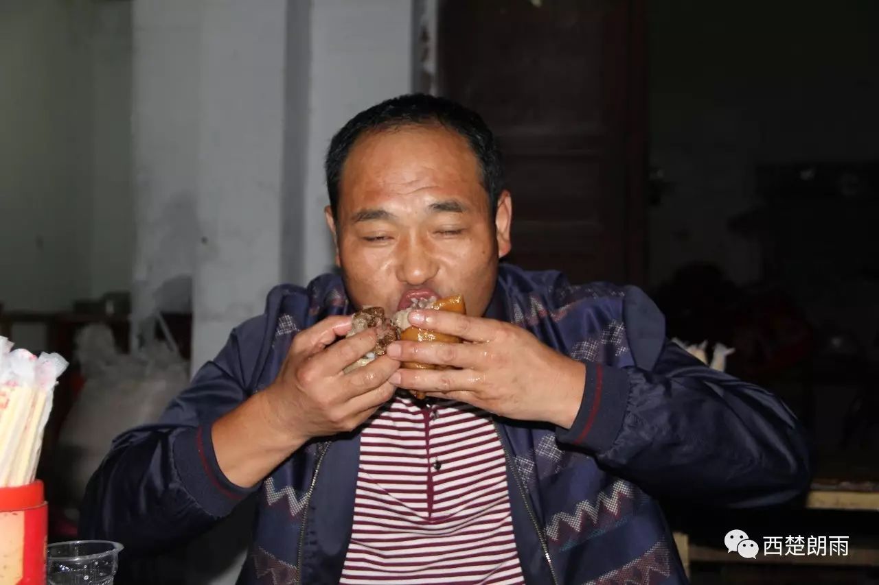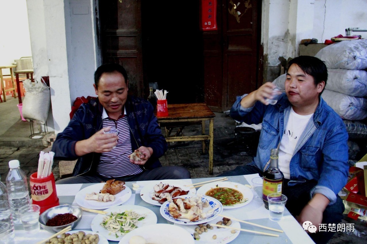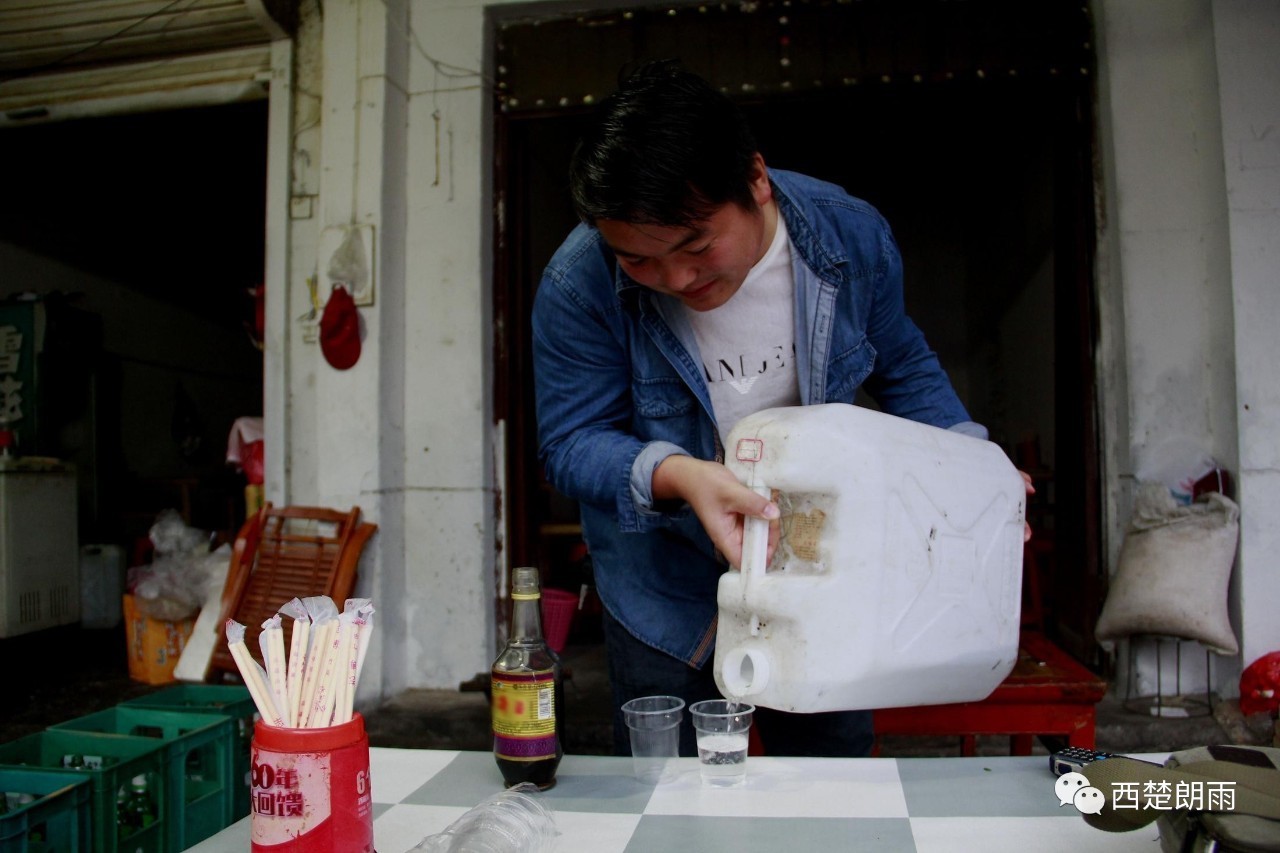 一位小伙美滋滋地倒着散酒,准备猪蹄配散酒。古井镇是有名的十里酒乡,酒厂有100多家,散酒很便宜,一杯只要3块钱,还是地道的粮食酒!