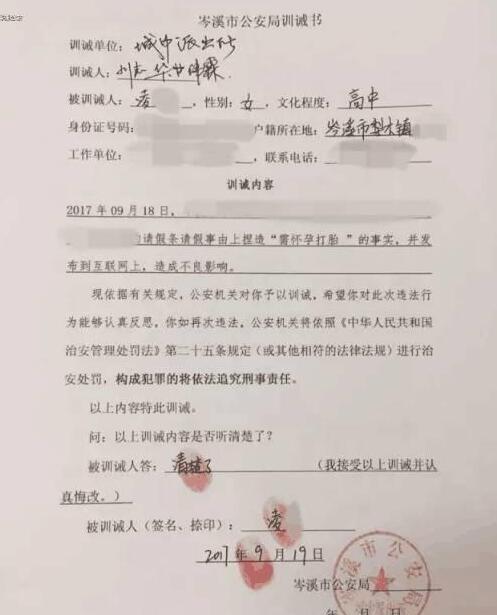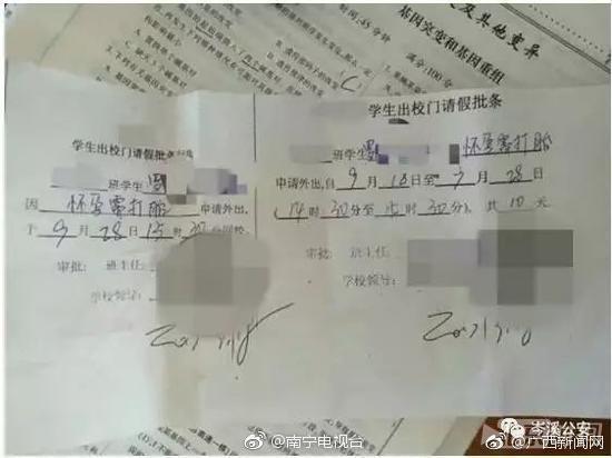 9月18日晚9时许,岑溪市公安局城中派出所接到某中学报警称,有人将一名在校学生请假条的请假事由改成“怀孕需打胎”,并发到互联网上,对学校造成恶劣影响,要求派出所协助调查。据写请假条的女同学罗某表示:9月18日上午,班主任安排她和另一名同学下午拿班上的扶贫小本出校外去盖章并写了请假条,但没写上请假事由,就直接给班主任和校领导签字了。下午,班主任告诉她不需要出去盖章,随后她就把请假条给了同学凌某、莫某看。莫某在抢走假条后,在请假事由栏写上“为了请假打胎”字样后递还给罗某。随后,罗某用橡皮擦擦掉,凌某又叫罗某写上“怀孕需打胎”五个字,并把请假日期9月18日至9月18日改成9月18日至9月28日。她们用手机拍照并将这张请假条上传到她的QQ空间。该请假条在网上发布后,受到了众多网友的热议。通过教育,罗某、凌某、莫某3人对她们因个人法律意识淡薄,给老师、校领导以及学校造成了不良的影响,表示万分悔恨,表示今后一定会遵纪守法。