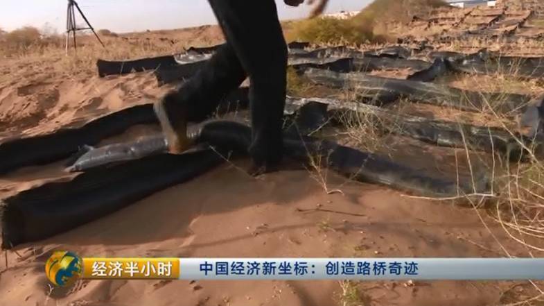 这是京新高速临白段的施工现场,原来固沙的关键,是这一个个两米长,20公分宽的填充式黑色沙袋。沙袋成田字形交叉叠放,形成一个个一平方米的小方格,连成一片,看似简单的黑色沙袋,实际上,暗藏玄机。