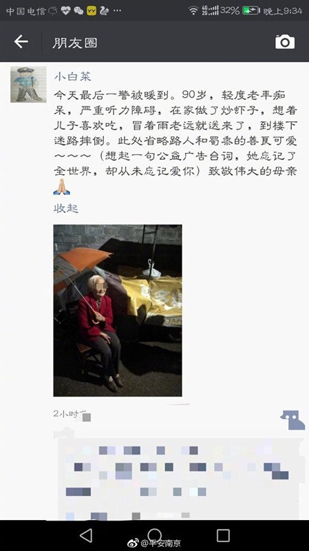 10 月 16 日晚上 6 点 15 分,朝天宫警务站接到市民报警,称有一位老太太在殷高巷摔倒了,需要救助。民警魏岩当即和同事赶到现场。"报警的是两个女中学生,等我们赶到时,已经有热心市民将老人扶起。但由于老人说话含糊不清,大家都不知道老人怎么会出现在这里。"魏岩告诉现代快报记者,他在现场看到,老人穿着整洁,打着伞,手上还拎着一个塑料袋,里面装着一个小锅,看样子是做的菜。根据这些民警分析,老人到这里应该是有目的的。