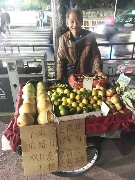这位性格慈祥憨厚,一看就很面善的余大爷把自己的水果摊摆在了夜市的边上,靠不错的路人缘卖点自家的水果。最近临近双11,不少常来光顾的熟客发现大爷的摊子上多了一块牌子,上书:水果不会说话,价格让你害怕,双11差点合作,价格优惠多多。