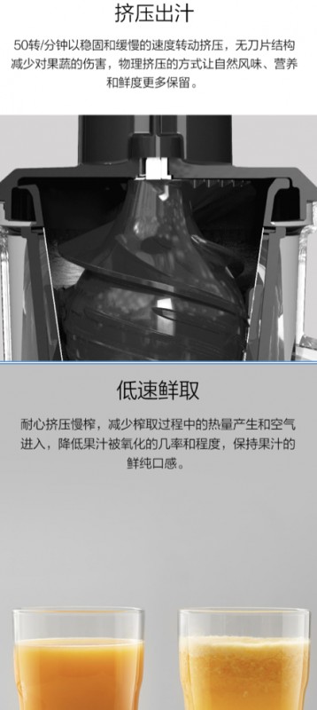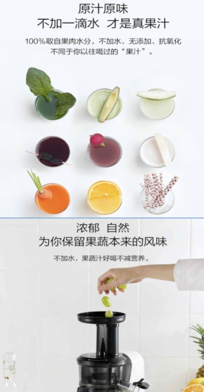 鲜生活走起!时尚潮流单品,点亮你的小清新,随时蔬果汁,健康鲜活力。新鲜果汁,营养美味,大口径原汁机,营养巨满足,真材实料,高出汁才算多,更多果汁,更多营养,喝下整个水果,每人一杯,给全家人营养关怀。