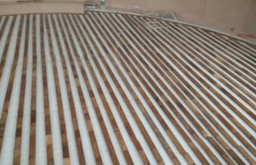 防潮膜在木龙骨的上面呈波浪形,地板与防潮膜之间产生较大缝隙,潮湿空气就很容易进入到缝隙中,在潮湿空气的作用下,地板产生膨胀及瓦状变形。