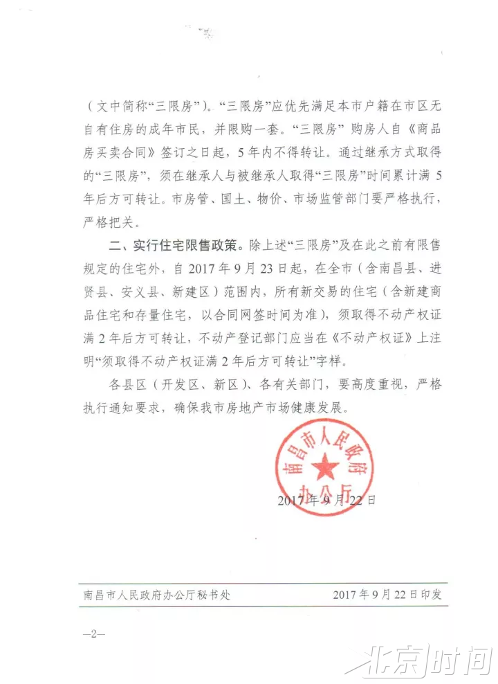同时,除上述“三限房”及在此之前有限售规定的住宅外,自9月23日起,在全市(含南昌县、进贤县、安义县、新建区)范围内,所有新交易的住宅(含新建商品住宅和存量住宅,以合同网签时间为准),须取得不动产权证满2年后方可转让。