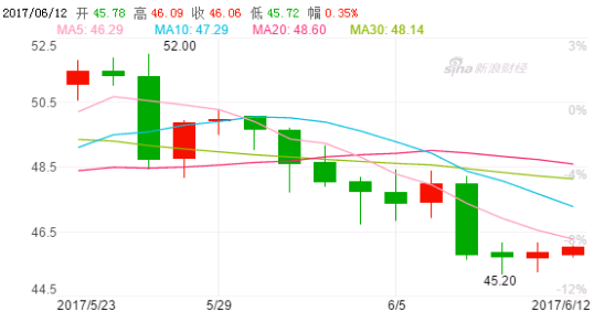 原油期货电子盘价格6月1日收盘下跌0.60美元,跌幅1.23%,报48.03美元/桶。原油价格到现在已经连续两周下跌,6月12日收盘原油下跌0.16美元,跌幅0.35%,报46.06美元/桶。