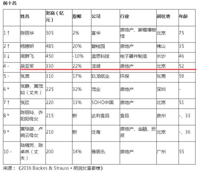 分出200亿后,她的身价缩水近一半。2016年的胡润女富豪榜中,吴亚军排名到了第四。