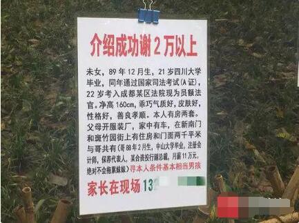 近日,成都人民公园相亲角,一则相亲启事在微博引起热议。这位女子的基本信息一目了然,现在是公务员,哪哪都好,性格也好,有两套住房。父母是生意人,有住房有门面,哥哥年薪11万,绝对不会拖累妹妹。如有介绍成功酬谢2万以上。