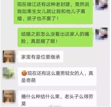 近日,靖江一名女子网上爆料公公“生男奖10万,生女回娘家”的奇葩“家规”。