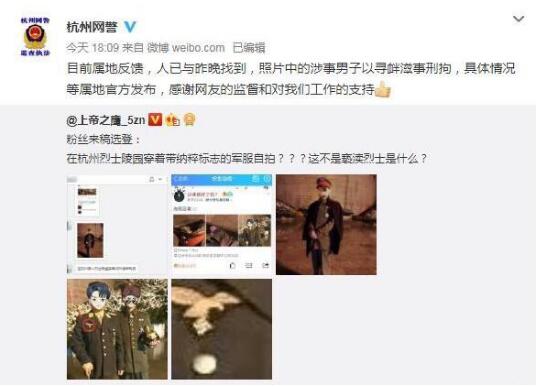 1月2日报道 新年伊始原本是一件开心的日子,可有位想“作死”的男子却声穿带纳粹标志军服在浙江杭州的烈士陵园“玩”自拍。不料现场被一网友发现后举报,当地警方已将其抓获并以涉嫌寻衅滋事罪将其刑拘。