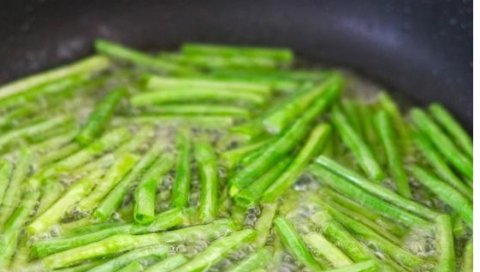 第2步:锅中倒入植物油,烧至5成热的时候,把冲洗干净沥干水分的豇豆放进去煸炒,煸炒至表皮比较皱的时候,捞出控干油分。