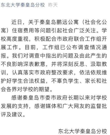 9月1日下午,秦皇岛市政府联合工作组通报了东北大学秦皇岛分校鹏远公寓被曝“天价住宿费”问题(戳此回顾):通报称,鹏远公寓一人间、二人间、三人间系未经审批设置,多次自行调整学生公寓收费标准;秦皇岛分校也存在工作中有明显疏漏等问题。