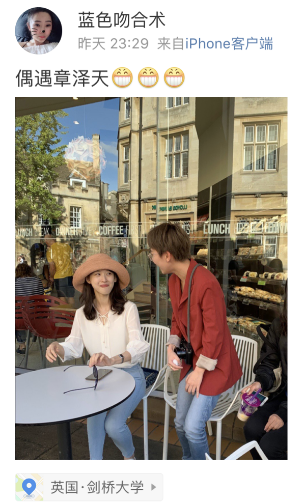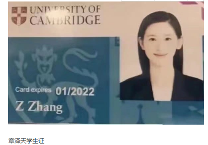 据了解,一个多月前,章泽天的剑桥大学学生证流出,引发网友对她赴剑桥大学读书的猜测。随后,章泽天在时隔一年中断更新社交网络动态后再次频繁发文,分享自己的日常生活,证实将在剑桥大学继续学习。