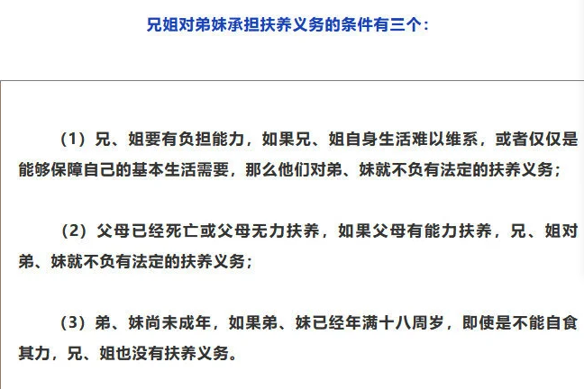 据了解律师表示:根据我们国家的婚姻法和即将生效的《民法典》的规定,如果父母对于孩子没有抚养能力,这种情况下,兄弟姐妹是有抚养义务的。