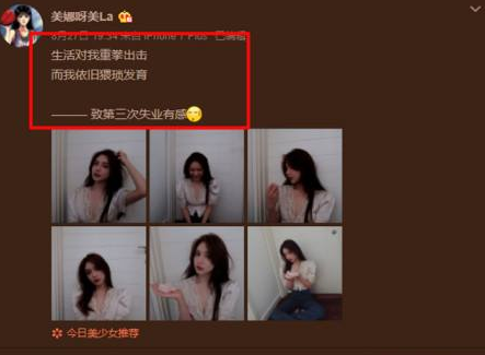 这不,这次NBA短暂的罢赛,也是美娜的第三次失业,美娜在微博上也是感慨了一番,表示“生活对我重拳出击,而我依旧猥琐发育”,最终也是给了自己这句话一个标签,那就是“致第三次失业有感”,看状态美娜也是做好了长时间休息的准备。